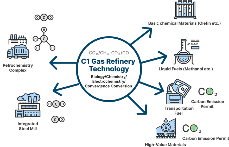 - We are developing large-scale C1 gas conversion technologies that support NDC targets and meet the practical needs of industry. To ensure the economic viability of these technologies, we are advancing and validating core processes for converting low-grade byproduct C1 gases into value-added products.
